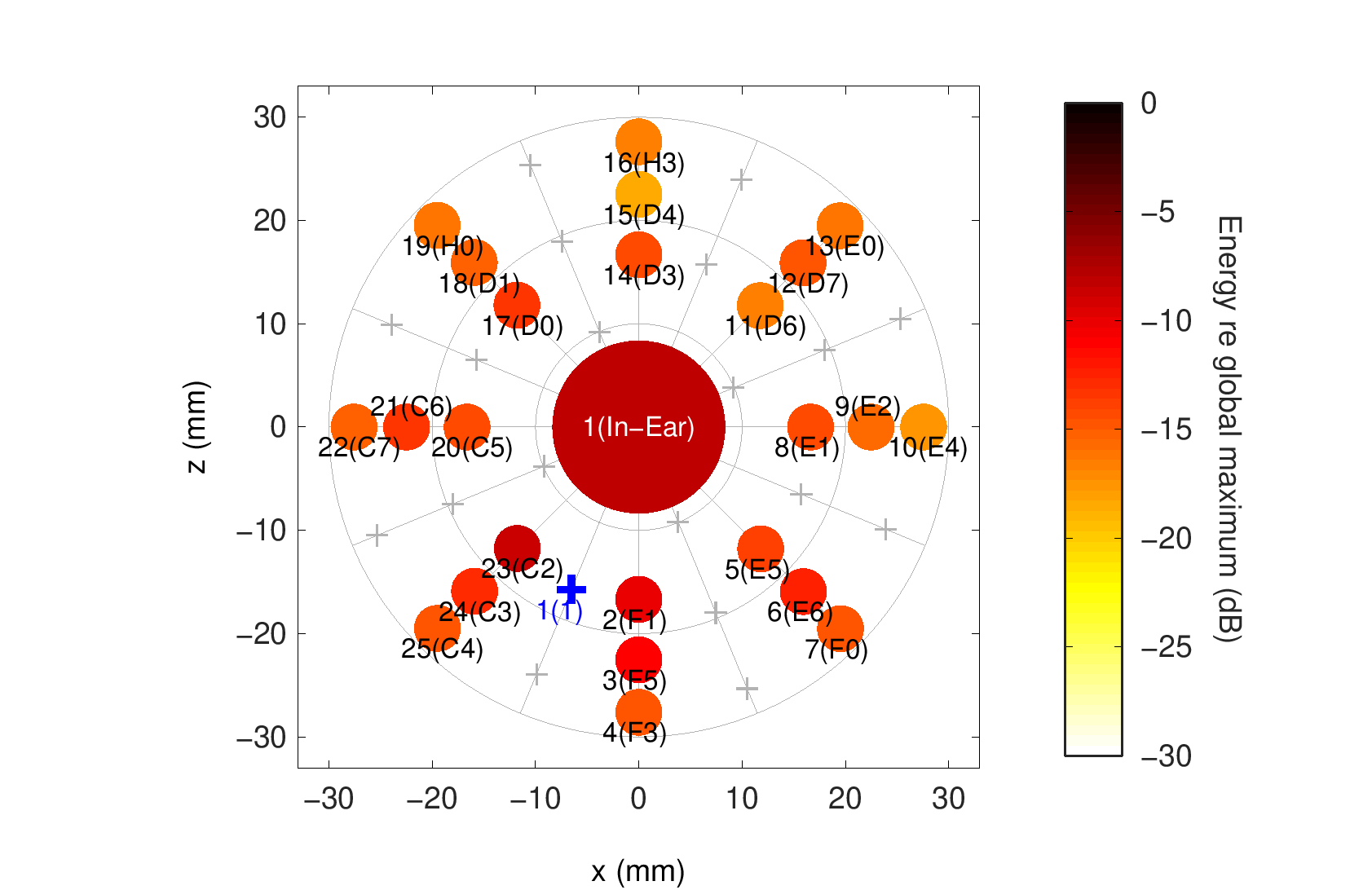 | Note: Sums of squared IRs at receivers (coloured dots) when one emitter is active (blue cross). The position of the in-ear microphone is indicative only as the actual position has not been recorded. |
